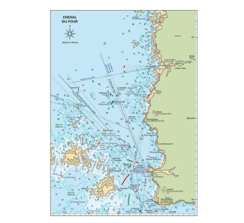 The Chenal du Four is the shortest route to Biscay ports and avoids the larger seas and heavy traffic outside Ouessant. The channel is wide and deep and the navigation is not difficult. However, the strong tides and exposure to the Atlantic swell often result in steep seas, and the visibility is sometimes poor.